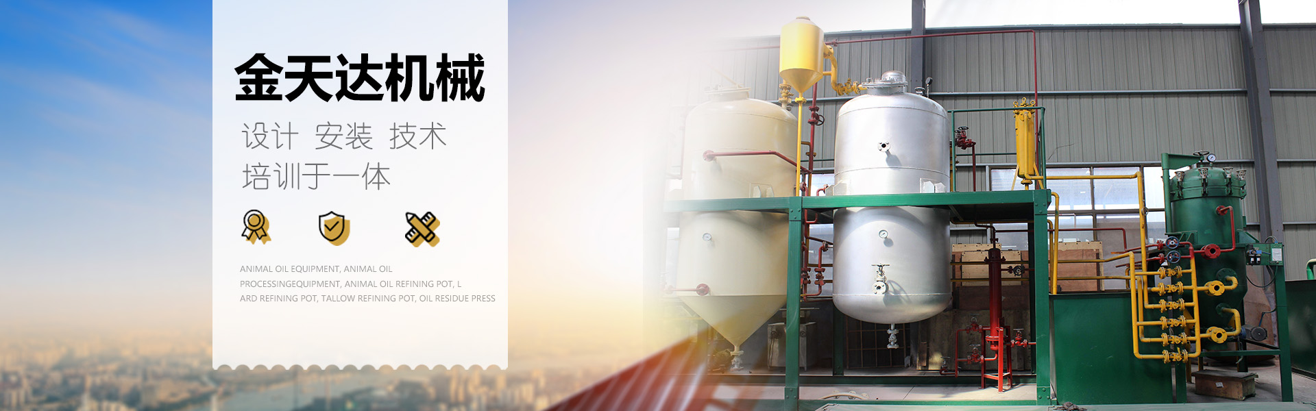郓城金天达机械设备有限公司设计、安装、技术培训于一体,郓城金天达机械设备有限公司经过多年的风风雨雨,拥有良好的经营环境和高素质的人才,集中了设备研制的高科技人才、并经过严格训练的各类人才。 郓城金天达机械设备有限公司主要经营范围:油脂化工设备、环保净化设备、烘干设备、输送设备、环卫设备、农业机械、制造与销售及进出口业务;环卫车辆销售。 本公司欢迎各界朋友前来合作交流!